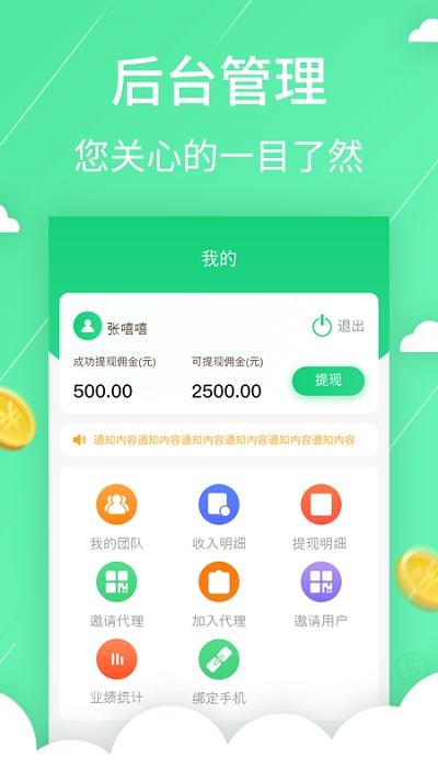 资金管理:商家用户的收入、支出管理模块。