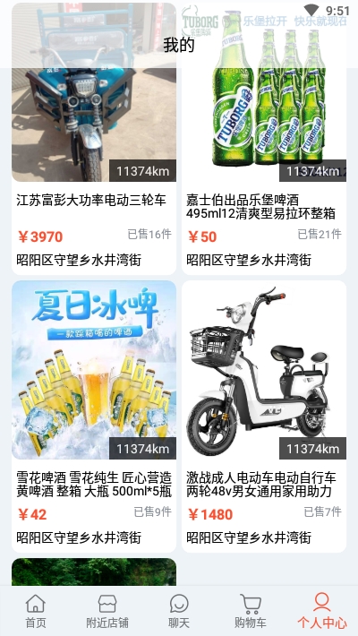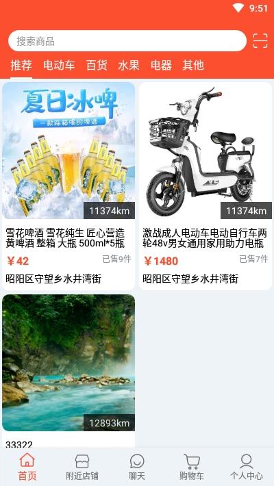 商品。可选择喜欢的商品进行下单购买,查看商品的详情介绍,可看到商品与自己的距离。