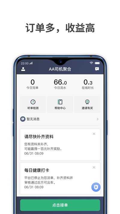 为司机提供接单服务平台,一键成为AA司机,赚钱更省心,平台用户长期活跃,订单数量充足。