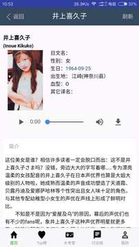 想找自己喜欢的动漫的详细资料?本软件是一款专门为动漫迷们定制相关资料查询工具。可以根据动漫的名称查询到自己喜欢动漫作品的详细信息,包括动漫剧情介绍、动漫的集数、制作人员名单、配音演员名单、出品时间和日期等。 软件还支持动漫声优的查询,可以查询到自己喜欢的声优的详细资料,包括日文名、出生地点和日期、详细介绍以及他(她)所参与的动漫角色配音。