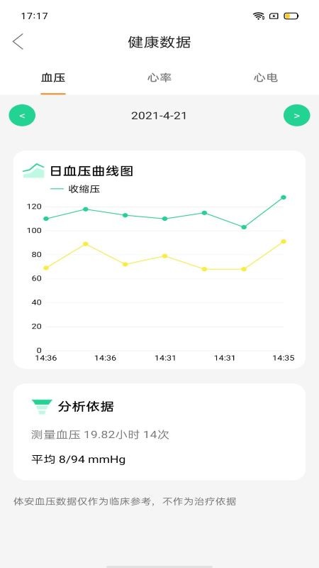 2、这里提供心率、心电、血压等健康数据,能帮助你及时了解自己和家人的健康情况
