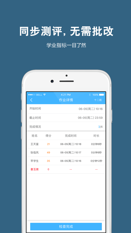 3. 点击“布置任务”与“检查任务”,查看学生参加情况,多媒体点评让您与学生之间更好地交流
