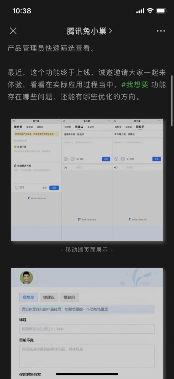 而针对#我想要 反馈界面,额外提供了目前的不爽和我的解决方案两个输入框,希望通过提供阐述思路引导,帮助用户更详细地反馈问题,并且提供自己的解题思路,让产品管理员能清晰的理解用户的思路,从用户的角度思考产品设计。