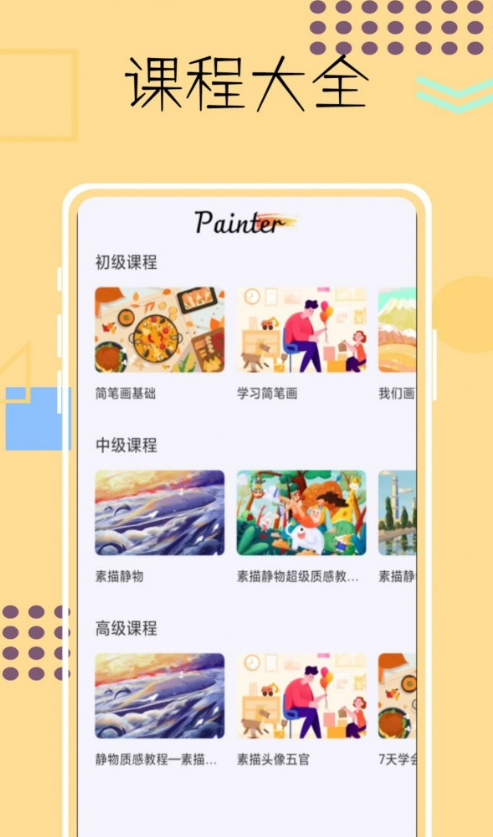 课程大全,各种不同的绘画课程都可以去学习,手机就可以进入到学习的行列中