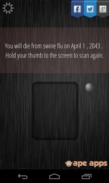 什麼時候你會死嗎?這個應用程序會告訴你!的猜測出你的命運,你的未來你自己的手中。你將能夠使用這個應用程序後,準備為你的餘生。您的指紋掃描和讀取你的未來。這個*版本的死亡掃描儀指紋掃描儀有趣的新選擇,將讓你玩你的朋友或敵人,*終的惡作劇!現在,您可以按“菜單”按鈕,進入“自定義響應”選項。用這種方法,你可以說什麼你告訴它使用掃描儀時,使應用程序。剛看到你的朋友面臨的外觀,當你告訴他們,他們就要死了!只要將你的拇指上的掃描墊,等待完成的掃描和計算,並看到什麼應用程序認為你會死的!死亡掃描儀僅是出於娛樂的目的,實際上並沒有掃描您的手指打印真實的。這是不可能的。它仍然是一個偉大的政黨或留下深刻印象的女士們在俱樂部的插科打諢! - 玩笑話,上你的朋友和家人! - 惡作劇你的鄰居誤以為你的手機可以檢測他們的死亡時間! - 有一個切合實際的掃描條,使得它看起來像它的實際讀取您的打印! - 設備振動在掃描過程中,以增加真實性! - 易於使用,沒有說明需要! - 可反复使用幾個小時的無盡樂趣!這可能比你想像的更準確!我一直在尋找提高我的應用程序,所以請留下意見與建議的事情,我可以補充,使之更好!我經常更新反饋的基礎上!你還等什麼!你的朋友留下深刻的印象!欺騙你的敵人!獲取的女孩!一切都是可能的,當你下載死亡掃描儀!測試的Galaxy S II,電池不包括在內。