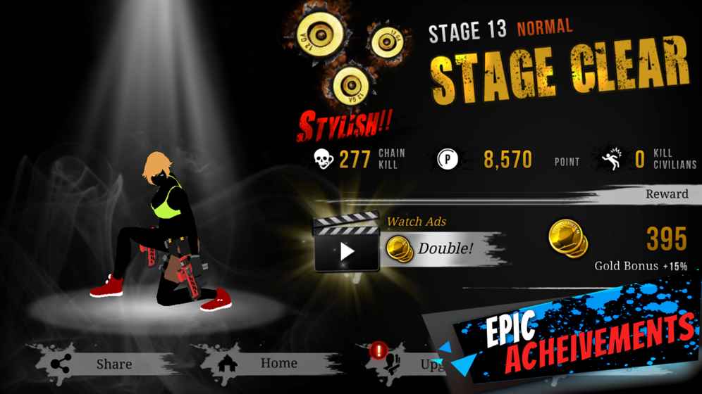 若按动玩家角色,则子弹时间被启动!若启动子弹时刻,则时速变慢,可以轻易处理敌人,也可获得奖励积分。在子弹时间结束后,若重播相机上的瞬间,则可尽情领略时尚动作的极限,千万不要错过!