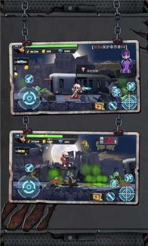 游戏采用了卡通风格制作,横版射击挑战,操作上使用摇杆和按钮控制,左下角摇杆控制主角左右移动,有侧有一个很大的普通攻击按钮控制射击。