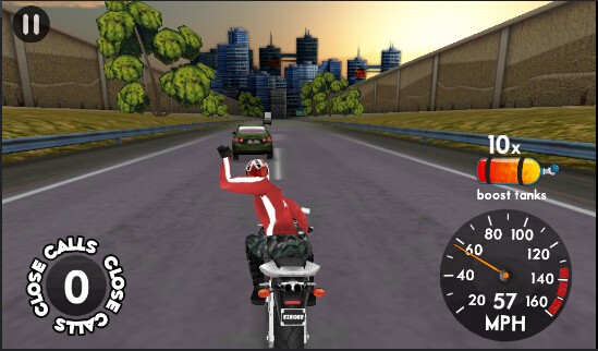 游戏操作简单,左右倾斜设备即可,贴近车辆并超越时会有加速效果,并累计积分。可支持 GC 2人联机,有人物和摩托皮肤可换。除了这些之外,当你被车撞飞后,可以享受身躯在空中飞腾,被后来车辆碾压的快感,游戏也会自动帮您拍照留念。最后,在人物倒地不动后会统计身上所受伤害,哪根骨头碎了,哪根骨头折了,是不是很炫呢?游戏用来休闲下还是很不错的。推荐给喜欢竞速类和休闲玩家尝试。