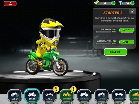 在游戏中玩家将驾驶着摩托车享受极限运动的乐趣,游戏中采用了卡通风格的画面设计,看起来角色的人设特点还是非常明显的,头部看起来非常大,这种画风看起来还是非常有趣的。此外游戏中也为玩家准备了许许多多不同的外观方案,除了车手本身有不同的选择之外,就连摩托车也有不同类型的车型可以选择,不同的摩托车属性都是不一样的,游戏中玩家的选择还是比较多的。、