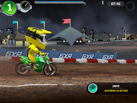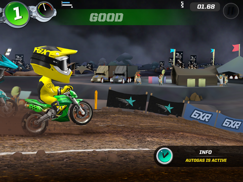游戏中的操作还是非常简单的,在比赛开始前,玩家需要控制时速表上的指针保持在绿色区域里,只有这样玩家才可以保证自己的车手能够以完美状态起步。在行驶的过程中摩托车的加油是自动的,玩家完全不用做任何的操作,这一点还是十分方便的。而到了上坡需要腾空做花式动作的时候,在画面下方会出现一个蓄力条,而且蓄力条会自动进行蓄力,当蓄力到完美范围内的时候玩家点击屏幕即可让车手顺利的完成腾空、花式动作、落地等一系列的动作,若失误的话,车手落地之后可能会对速度造成一定的影响。