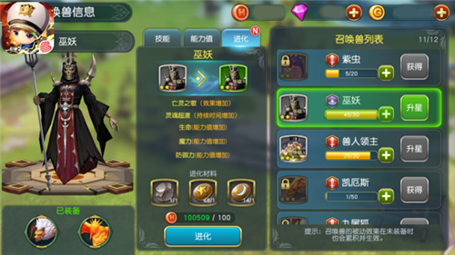 3、进化:召唤兽可以进行进化,消耗一定的材料即可完成该操作,进化之后召唤兽的主动、被动技能效果增强,各项属性的能力值也会增加;