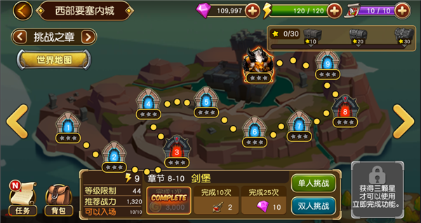 2.进入副本地图界面,可选择关卡进行挑战。点击下方“单人挑战”可开始单人副本,选择“双人”挑战可随机匹配或与好友开始双人副本探险。下方窗口中同样可以看到完成副本所能获得的奖励。