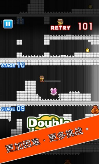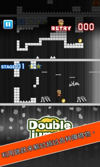藏宝猎人Bob,开始了新的一段更为艰难的冒险。【致新人】这是一款极其困难的动作游戏!!敬请注意!!在此我们推荐您先试玩此游戏的前篇【疯狂奔跑-DEAD END】以适应此款游戏。~第2章~Bob终于成功的逃离了藏宝洞。正在Bob庆祝的时候,在他的面前又出现了更加困难的新关卡。新的关卡「全部共有50层」,冲破层层关卡,再度使Bob重新回到地面是你的任务。▼【冠军级别疯狂奔跑-DEAD END-】是什么?每个关卡所需时间大约为「3.5秒」!如果你可以在完全没有失误的情况下,通关全部50个关卡,全部所需要的时间仅仅为「3分钟」!「疯狂奔跑 -DEAD END-」是一款有着自动奔跑系统和跳跃系统的,难度很高的动作游戏。【提示】: 此款【冠军级别】的游戏难度为极度困难。较之前作在难度上做了很大的提升。还请注意。▼游戏方法利用跳跃来跨越各种障碍物并最终冲破各层关卡。游戏开始时,Bob会从屏幕的左侧向右侧奔跑。玩家的可操作选项,只有跳跃一项。当玩家跳跃在空中时,再度点击屏幕将可以做出二段跳的动作。如果Bob不慎碰到尖刺或者怪兽,游戏将随之结束。(※地面或者普通墙壁,即使碰撞到也不会影响游戏。)利用跳跃,巧妙地躲过怪兽,跨越尖刺,最终到达屏幕的右侧即可通关。通关后将自动进入下一个关卡。?全部50关卡通关后,将会出现结局画面。▼操作方法1)点击屏幕:跳跃2)跳跃在空中时再度点击屏幕:二段跳▼来将全部50关卡冲破吧。「全部50关卡」通关后,将会出现通关结局画面。如果你能将全部50关卡通关,请将你的通关记录发到你的Twitter后者Facebook上!◇◆游戏要素:「金星奖励系统」◆◇游戏中,每个关卡玩家可以获得最大为3颗的「金星」作为奖励。你能收集到每个关卡所隐藏的3颗金星吗?金星奖励条件。1)冲破关卡。2)获得关卡中的宝藏。3)不使用重试,一次性冲破关卡。【记录画面确认】点击标题画面中的奖杯标志,可以确认玩家至今为止的游戏记录。玩家的通关次数和获得的金星奖励会显示在画面中。全部共有150颗金星作为奖励,你能集齐所有的金星奖励吗?◇◆不可能完成的任务!?不使用重试,一次性通关!?◆◇冲破全部50个关卡,而不使用重试。你能做到吗?对普通游戏玩家来说将会是个无法完成的任务。◇◆终极游戏操作!「不使用重试」+「获得全部3颗金星奖励」将会达成完美通关◆◇来试试「不使用重试」冲破全部50个关卡,并获得全部的3颗金星奖励吧。如果你能做到这些,将是你做为骨灰玩家的最好的证明。