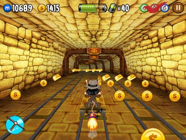游戏的画面很清新亮丽的,场景变化丰富,采用现在跑酷游戏都很流行的身后视角,多线立体式的跑酷类游戏最近越出越多了。操作上也是大家非常熟悉的,分别向上下左右四个方向划屏控制Hugo跳起和蹲下,以及矿车左右换轨。此外游戏还加入了倾斜的概念,利用重力感应让Hugo左右侧身,可以避开铁轨上的刺球,吃到铁轨旁边的金币。