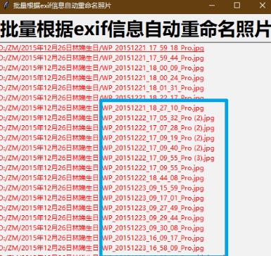 第二:点击开始重命名,然后耐心等待即可,为了省时间,重命名成功的提示没有写出到黑窗口,只输出因拍摄时间同样(即那种1秒拍了十几张照片的,exif中的时间信息一模一样)而导致重命名失败的提示,此时,会自动加上后缀数字1到50,循环50次重命名,当某次重命名成功,会跳出循环,继续下一个照片重命名(之所以循环50次,就是防止有些用户用设备1秒拍出了50张照片)。