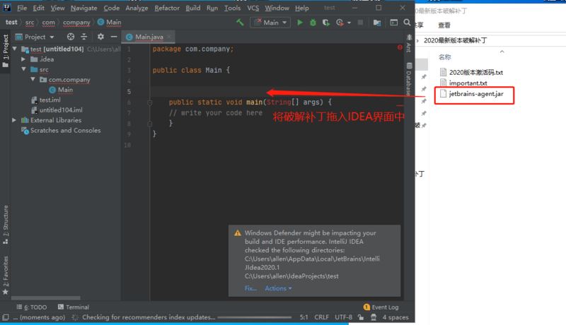 将网盘中 2020 版本文件夹中的补丁jetbrains-agent.jar拖入 IDEA 界面中: