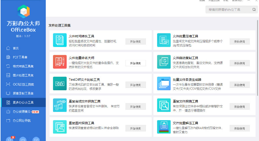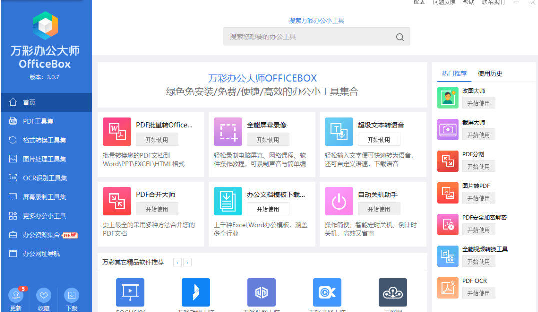 万彩办公大师 Office Box是一款由广州万彩科技有限公司研发的免费办公工具软件超级套装(桌面软件),几乎可以满足日常各种办公工具需求。它内置了60多款强大的,无任何广告及插件的绿色办公组件如PDF工具集(PDF转换(PDFto word/ Excel/PPT),PDF合并分割水印);文档/音视频/图片转换工具集;OCR工具集;屏幕录制工具集;图片处理工具集;文件处理工具集等。所有的套装工具不需要安装,直接可以绿色加载启动,省去了用户为安装各种办公软件而寻找工具、安装及卸载的麻烦.