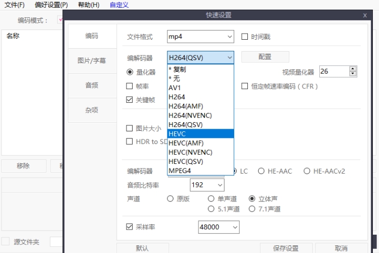速度:该设置里的名称会根据编码器变化,其原则就是速度越慢,质量越高,体积越小。
