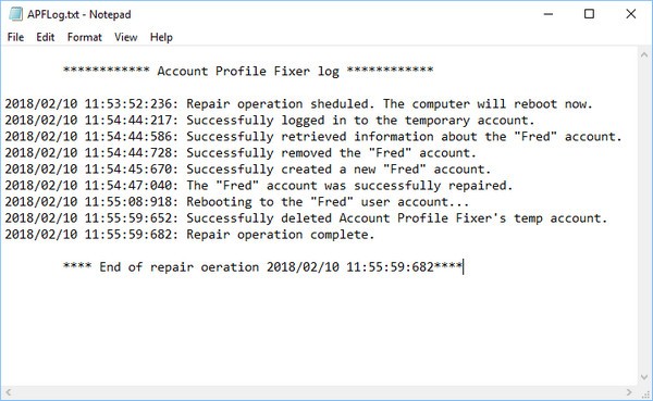 最后,APF将再次重新启动,自动登录到修复的用户帐户,删除临时帐户,并显示修复操作的日志。