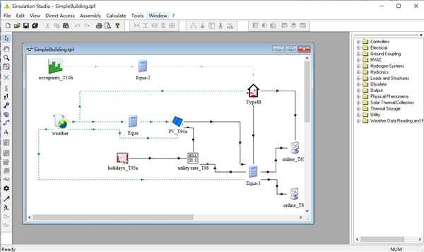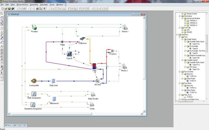 TRNSYS Simulation Studio充当了强大,直观,图形化的模拟前端,使用户组装详细系统的工作变得非常简单-本质上类似于在真实系统中连接管道和电线。一个组件的输出以图形方式连接到另一个组件的输入。自1990年代中期成立以来,Simulation Studio取代了手动编辑文本输入文件的需求。