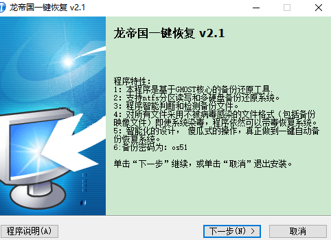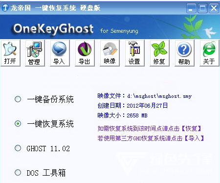龙帝国一键备份恢复系统的功能项有一键备份系统、一键恢复系统、GHOST镜像以及DOS工具箱,由该应用对电脑内需要备份的文件做完整的检查,迅速完成本地文件数据的备份恢复过程,同时还可以把系统内部的分区做进一步的调整优化,提醒用户及时处理影响电脑文件处理的问题,按照提示走准没错。