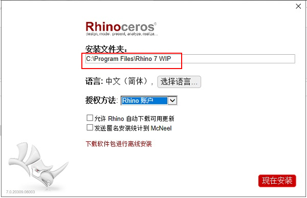 2、双击"rhino_zh-cn_7.0.20309.06003.exe"开始安装,默认安装目录【C:⁄Program Files⁄Rhino 7 WIP】点击右下角的现在安装;