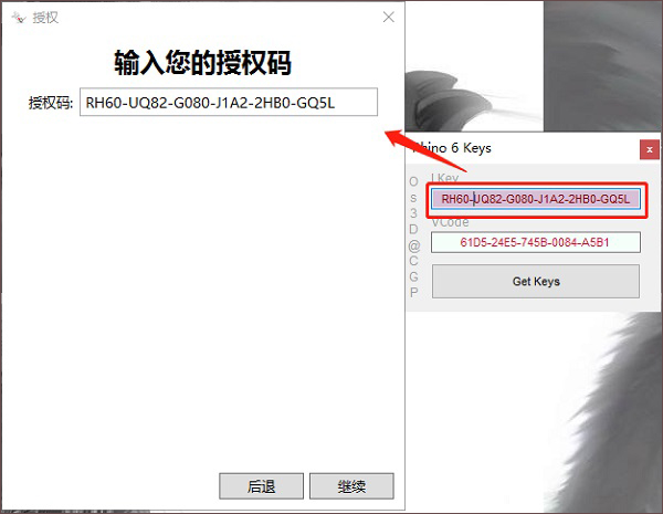 6、运行注册机RH6KEYS.exe,将Lkey中的授权码输入框中,点击继续;