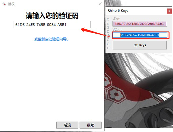 9、接着就是弹出验证码之后将注册机中的Vcode输入验证码框中,点击继续;