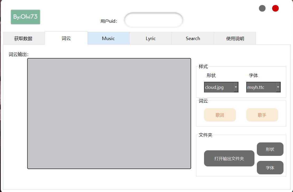 选择合适的形状以及字体,点击歌词或者歌手,生成词云。在形状和字体文件夹可以加入自己喜欢的形状图片或者字体文件。