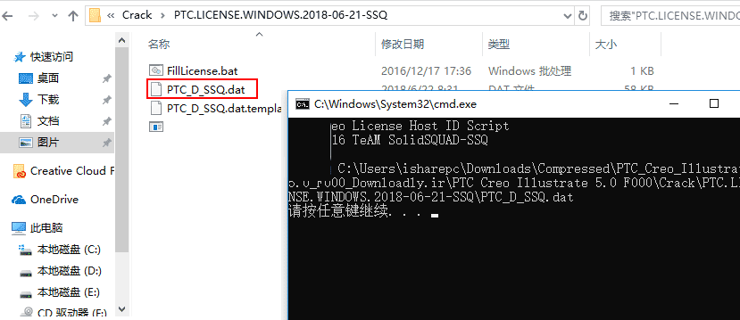 1,打开Crack文件夹,右键管理员身份运行FillLicense.bat,会自动生成PTC_D_SSQ.dat许可证文件。
