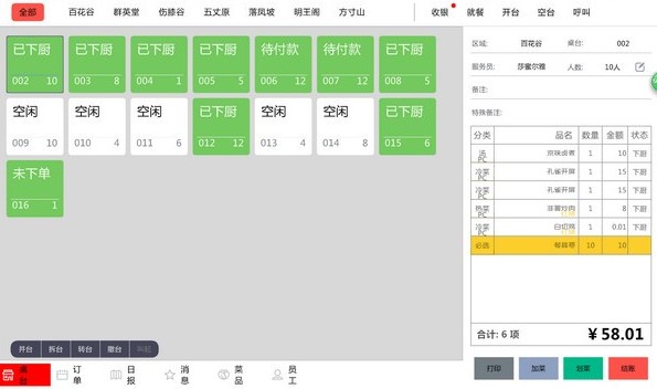 桌台状态实时全览,1键进行桌台操作;点菜、加菜、买单1秒搞定,双倍加速餐厅运行速度