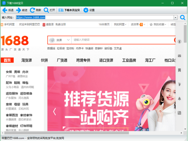 第一步:以1688为例,点击左上角下载1688宝贝按钮,弹出窗口中会自动打开1688的首页,如图所示:
