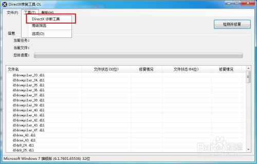 接着进入到修复工具的界面,在下方的列表会先显示所有的DirectX文件,接着点击右上角的检测并修复选项。