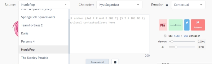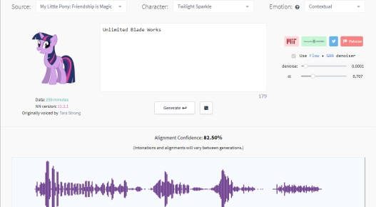供给了《小马宝莉》、《异闻录4》、《半条命》和《传送门》等作品中脚色的语音资料,玩家们可以在文本框中输出一些内容,转换选定脚色的虚拟语音。笔者就测验考试了一下让紫悦咏唱“无穷剑制”的尝试,固然AI的声响贫乏了些顿挫抑扬,不外结果也还算风趣。