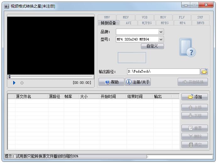 本工具会提供一个预览窗口,查看导入的文件是否正确,您可以一次性导入多个视频文件,统一进行配置并转换。需要各位用户注意的是,试用版只能转换源文件播放时间的30%,以便查看效果,想要体验完整的转换还需注册使用。