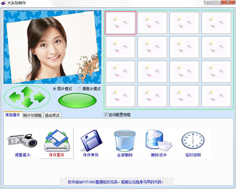 本软件的用户界面很简洁,在它的常规操作中,您可以调整镜头、保存整体、保存单张、全部删除、删除选中或者延时拍照,您还能够选择各种类型和风格的照片相框、组合样式,而且它还有一个自动配置相框的模式,随机挑选相框并生成。