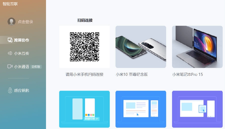 拥有小米手机的用户看过来,智能互联软件可以快速实现跨系统、跨设备的协作办公,只要使用手机自带的扫一扫功能,扫描该软件展示的二维码,就可以快速在电脑上显示手机屏幕,在大屏幕上操作手机APP,并且允许文件拖拽共享。