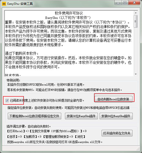 3、再运转"02EasyShu 插件装载包2.863.exe"顺序,点击主动判定 Excel 位数装载;
