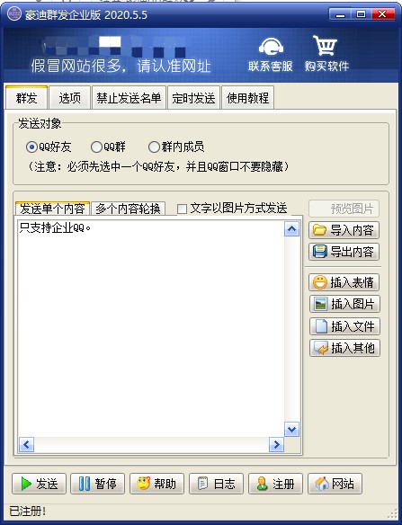 豪迪qq群发器工具可以设置QQ好友,QQ群以及单一群内成员来推送所有数据文件信息,并且还具备独立的选项控制以及黑名单限制的能力,这样能够把批量QQ信息所需传达的范围更为广泛,促进最短时间内消息群发的影响力,从而让更多人知晓当前推出的营销文案或者是图像海报。
