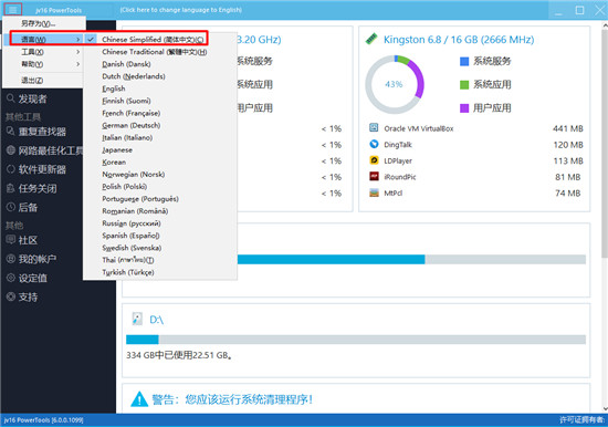 7、启动顺序后默许为英文场景布局,可点击左上角设置图标,顺次选择Language选择简体中文说话切换后,重启便可失效!