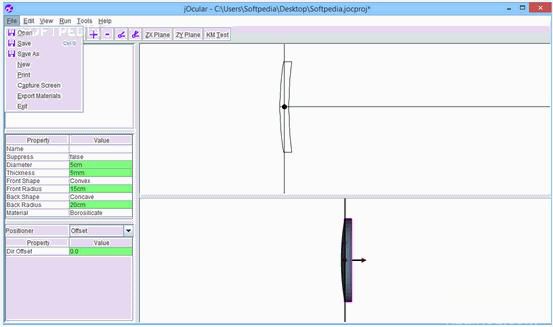 jOcular必须使用Java运行环境以保证运行,用户可以在它提供的光学对象库中选择指定元素,并添加到自己的项目中。它的光学对象库涵盖了球面透镜、三角棱镜、分光光度计等组件,以及真空、方解石等光学介质。
