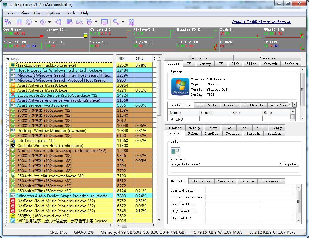 此刻你会感觉TaskExplorer对你来讲完全没有任何意义,其实大错特错,对通俗用户来讲,这个软件东西栏下方的资本监督器性能就非常的好用,由于它可以同时展示以下这些有效的信息。