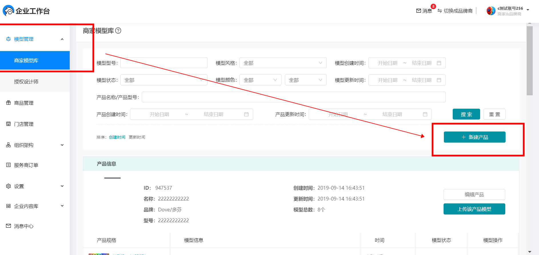 步调一:商家上传模型需求进入企业任务台,选择模型办理中的商家模型库,选择新建产物;