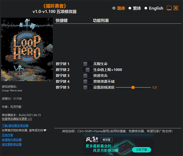 循环英雄五项修改器由大佬风灵月影打造,支持玩家调整《循环勇者(Loop Hero)》游戏的相关属性。该修改器可以通过Ctrl+Shift+Home组合键来启用和禁用快捷键,当处在启用状态下,可通过相应的数字键使用快速攻击或者无限生命等。