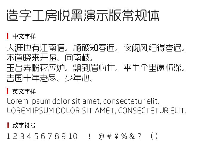 造字工房悦黑演示版常规体电脑版线条更加流畅,看起来更美观,给人留下的印象更好,更显大方。该字体笔画空隙的布局合理,边角处理得更柔和,给人的感觉更舒服,棱角不会过于突出,给人的感觉就是温和,更显大气。