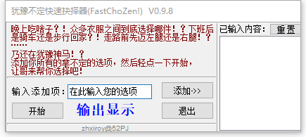FastChoZen(不定项快速选择器)专门为选择困难症群体设计,生活中遇到的任何事情都可以由它帮您做出选择。犹豫不决时,请在该程序内输入待选的选项,选项全部添加进来后,点击开始按钮,它就会随机滚动和显示选项。