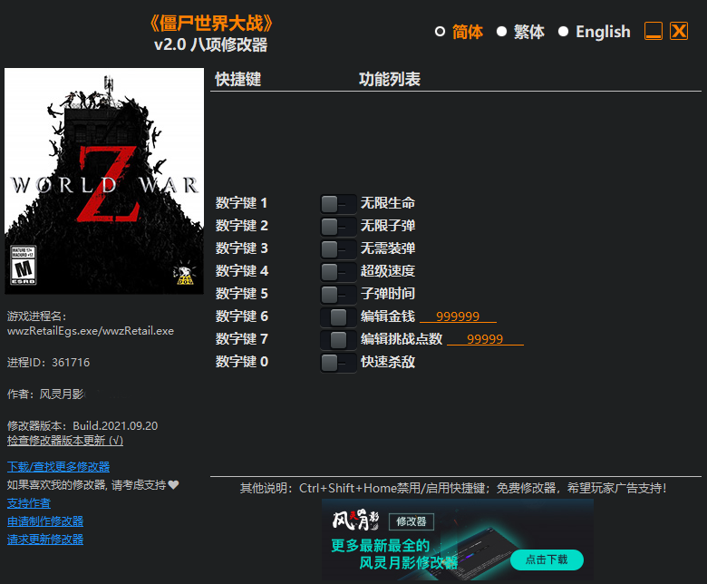 喜欢小编为你带来的《僵尸世界大战》八项修改器风灵月影版吗,喜欢的话就行动起来吧,你能在这里看到简单易懂的游戏辅助工具,你还能够在这里找到更多功能强大的辅助工具,让你一个新手也能够畅玩该游戏,欢迎你来游戏爱好者瞧一瞧!