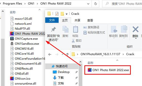 6、再翻开crack文件夹,将ON1 Photo RAW 2022.exe补钉文件复制到软件根目次下替代,如图所示;