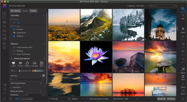 ON1 Photo RAW会提供包括RAW以及其他所有常见图像文件格式的图文内容处理,页面采用平行缩略图的模式以获得大概的初始效果影响,随后进行多次反复的比较拓展,使得本地图像的景深宽度以及图像编辑都会具备很是不错的同步效果。