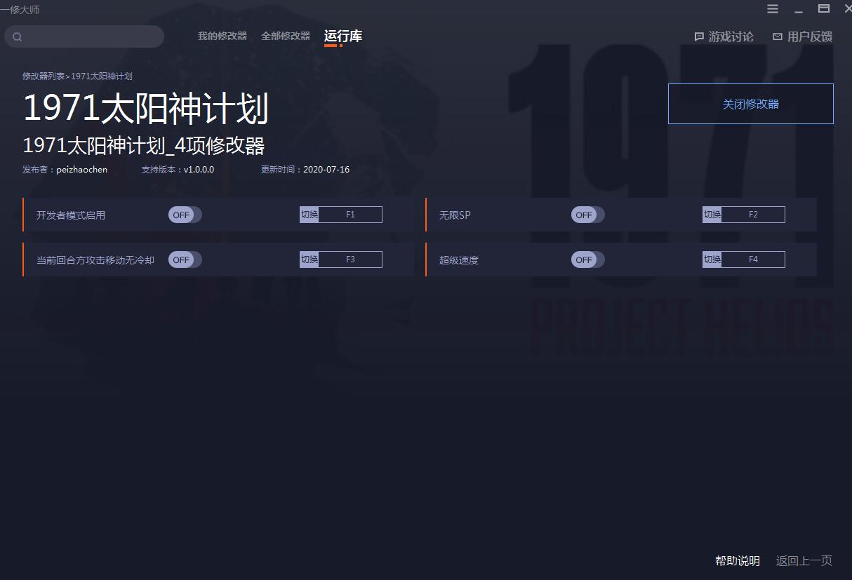 以上就是关于《1971太阳神计划》四项修改器的全部使用说明了,如果你还想要各种性能强大的相关游戏辅助软件就快快在游戏爱好者网站寻找吧!